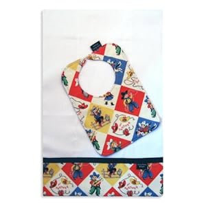 Product Description : Howdy Pard'ner! This bib and burp cloth set features a fun, retro cowboy and cowgirl print. The bib reverses to a colorful bandanna print and is lined with cotton batting for absorbency and features a snap closure. The cloth diaper burp cloth is enhanced with the cowboy print and ribbon trim on both the front and back. Both are 100% cotton and machine wash and dry. Handcrafted in the USA by moms for moms.
