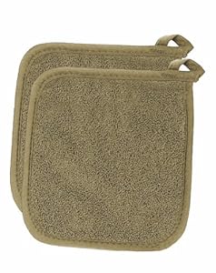 | 2013-02-18 19:22:28.250223-05 Category: Kitchen & Table Linens  Set includes: 2 100-percentcotton mocha brown potholders from the royale collection Made from 100-percent terry looped cotton; large size provides heat protection Each pot holder measures 8-1/2-inch long by 8.25-inch wide Coordinates with Ritz Royale collection: includes aprons, kitchen towels, dishcloths, checked kitchen towels, wonder towels, pot holders, Ritz Mitz, pocket mitts and cotton/neoprene oven mitts Machine wash cold water; tumble dry low Read more... |