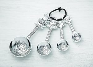 set of 4 - 1 TBSP, 1 TSP, 1/2 TSP, and 1/4 TSP Decorative and Functional Longest is approximately 4-1/2" long Made of durable zinc